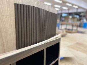 CNCエッジバンディング・マシニング・センター/ドリルのように回転する歯が上下左右に動きながら3次元に木材を加工していきます。木材の加工に加えて曲面エッジにテープやローカン材などを貼り付ける事が出来ます。最大1900×4200mmのパネルを加工可能